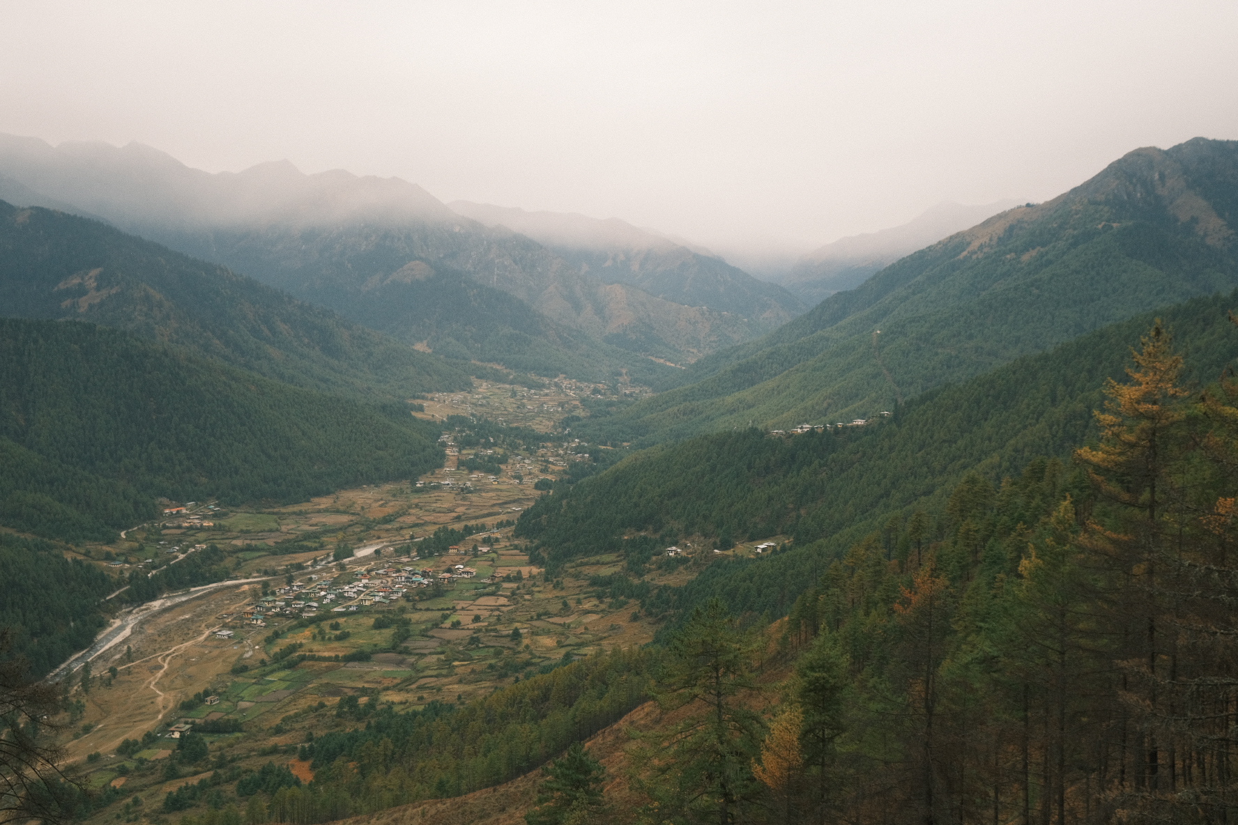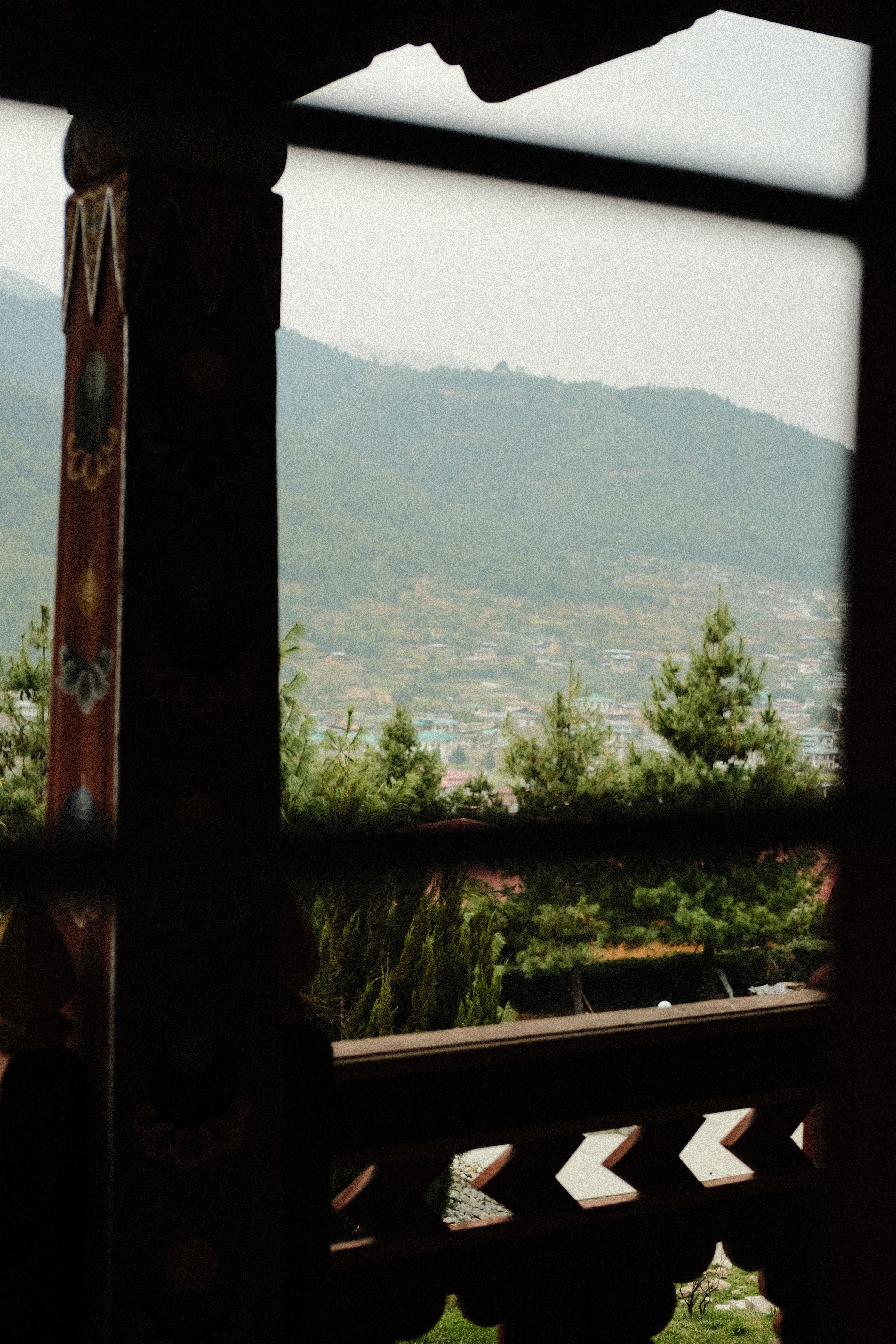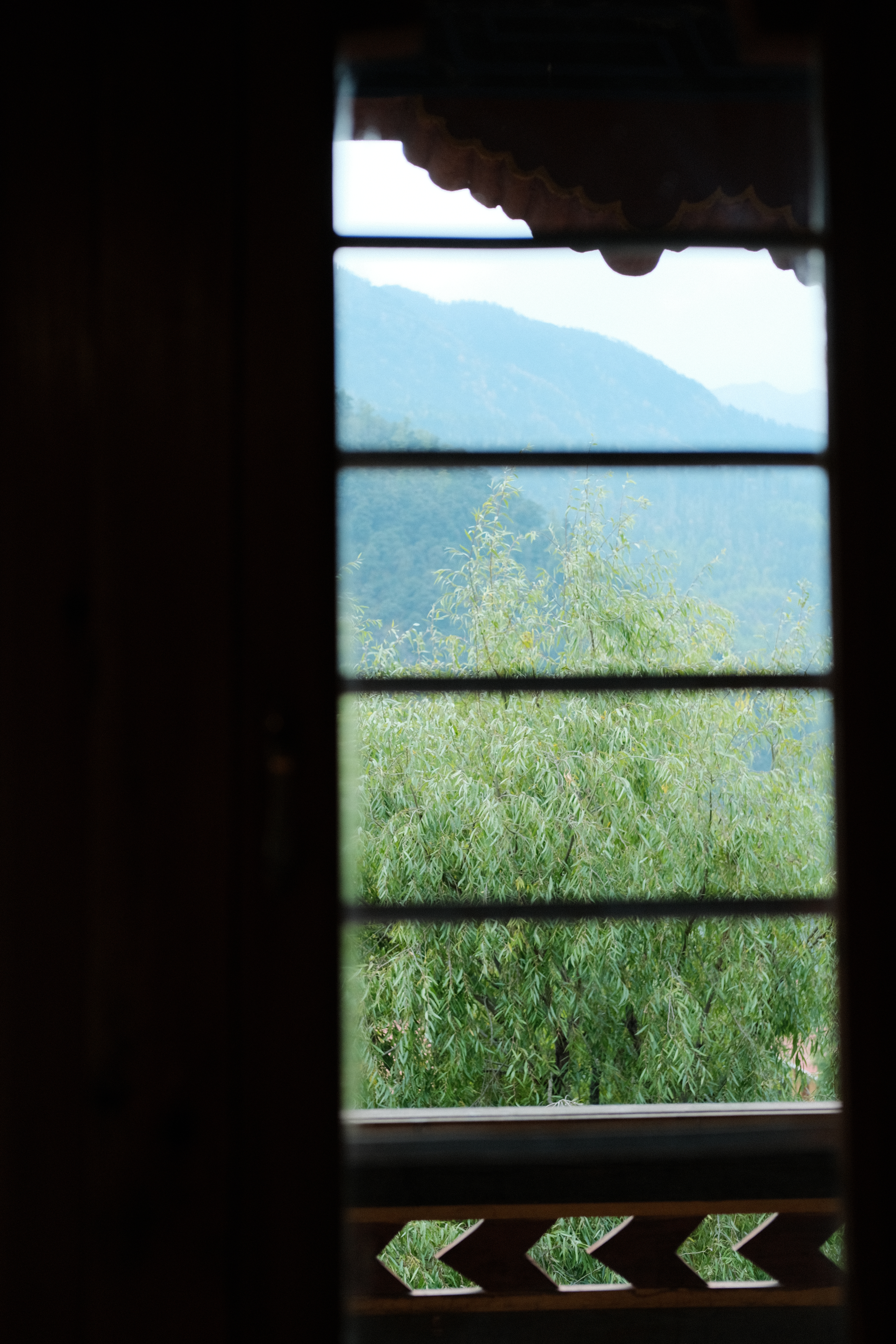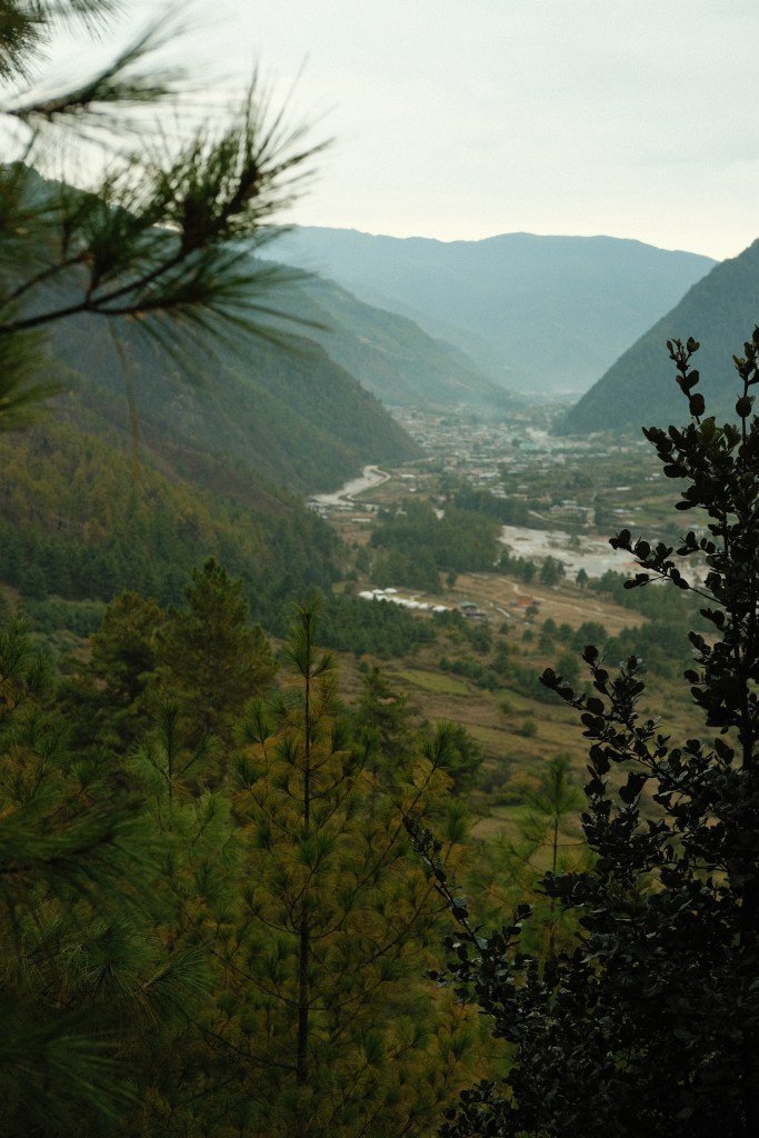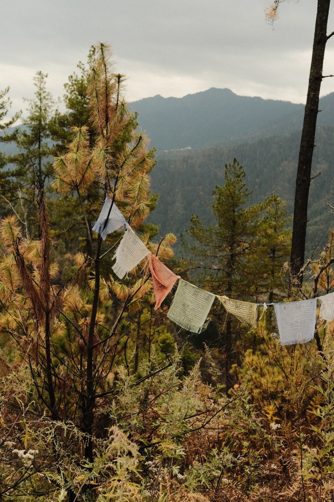We were blessed with a striking view of the valley and the Risums —three mountains variously embodying the bodhisattvas of Compassion, Wisdom, and Energy, who watch over the Haa valley and its people— and a vast forest of blue pine and brown oak (both native to Bhutan), and rhododendrons growing from the blackened ground, remains of a recent forest fire, all to the background song of cicadas.