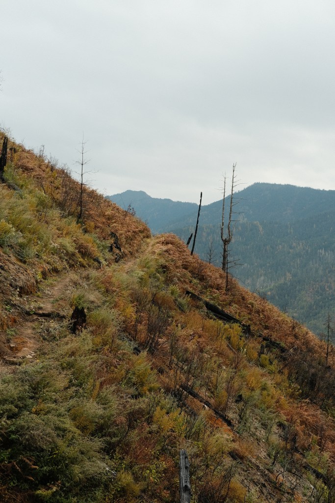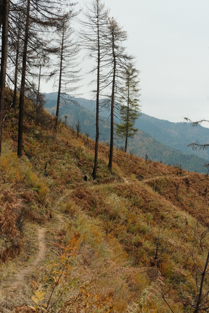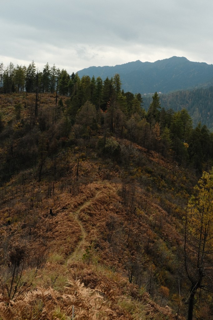 As we climbed the last hill through this blackened forest we dipped into a small valley which we would cross in order to climb back up Yangthang monastery.