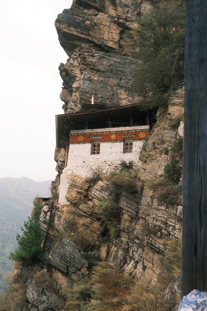 The climb was entirely worth it, however. The hermitage is an ancient and much-renovated building, built into the cliffside, where a single nun stood quietly by as DD showed us the saint’s holy footstep, embedded in the rock, and taught us fascinating details of the history of Bhutan and their buddhism.