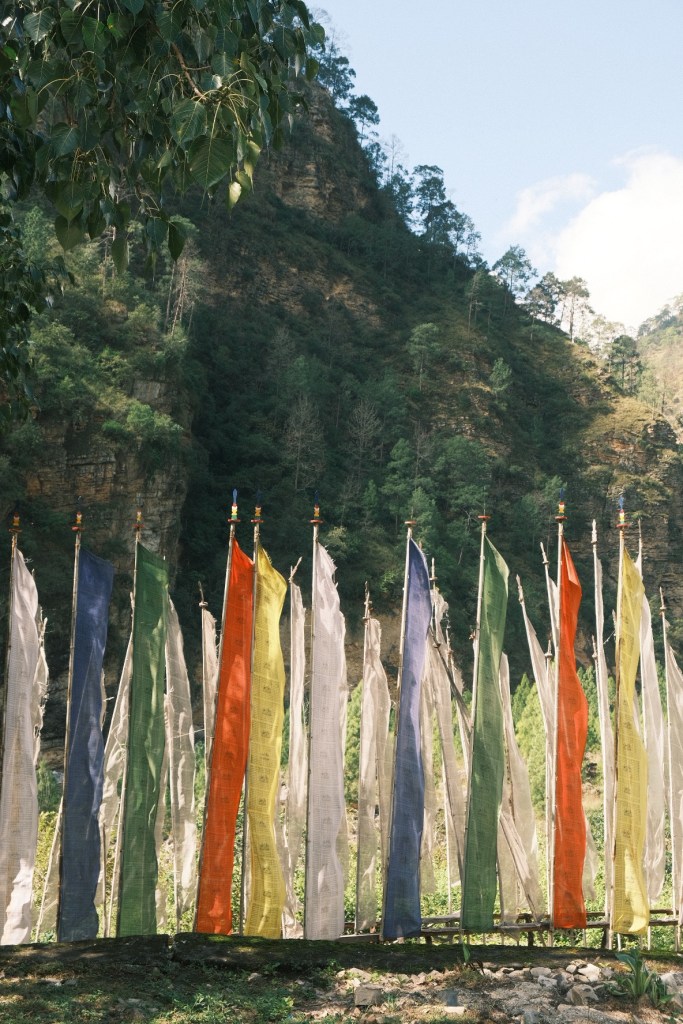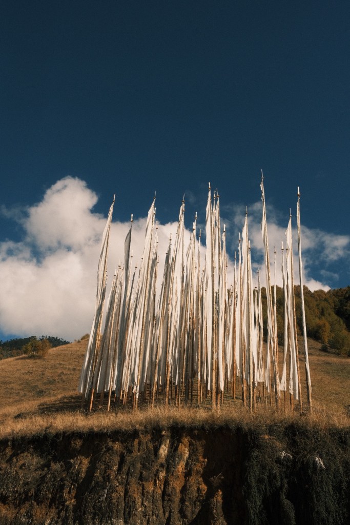Along our way, we regularly pass clusters of white prayer flags, which our guide calls shidhar. These are planted in groups of 108 to guide a deceased ancestor into the afterlife, and must be renewed every year.