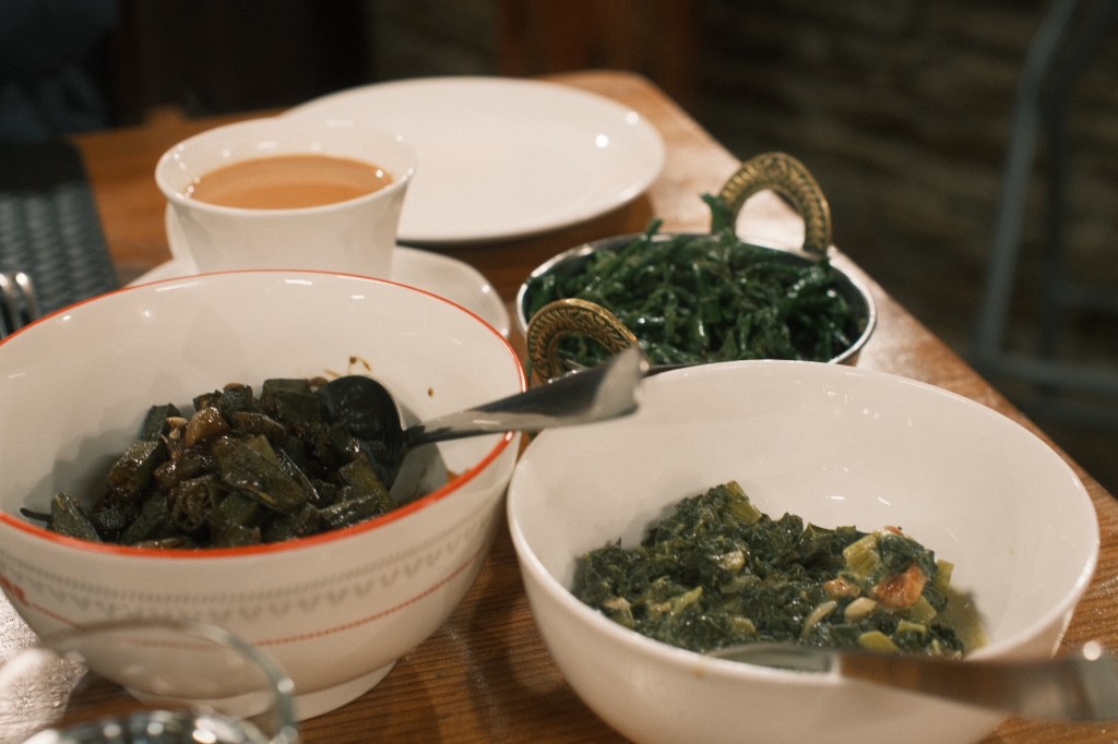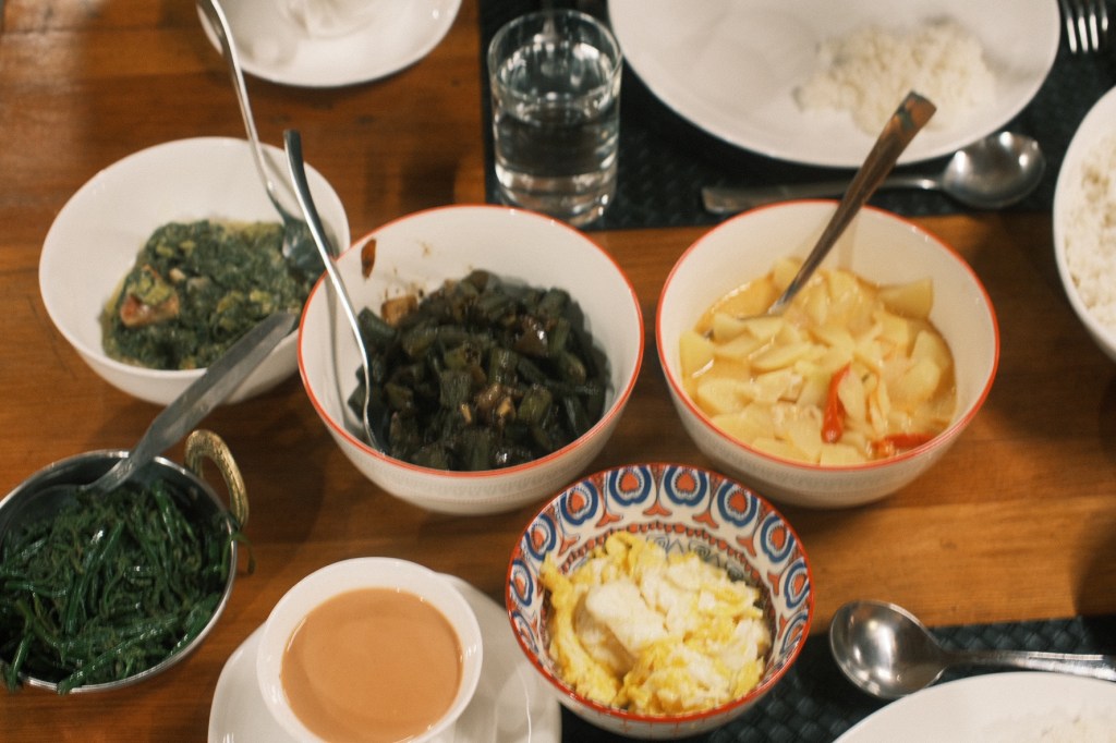 This is what dinner looked like in YongkolaIn the top right is the fiddle fern we showed you earlier, cooked with garlic, and delicious!