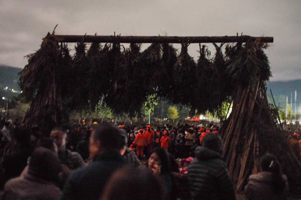 Here is what we found: a large gate made of pine wood and branches built in the middle of a field. A fire truck, many volunteers and many bhutanese spectators patiently waiting.