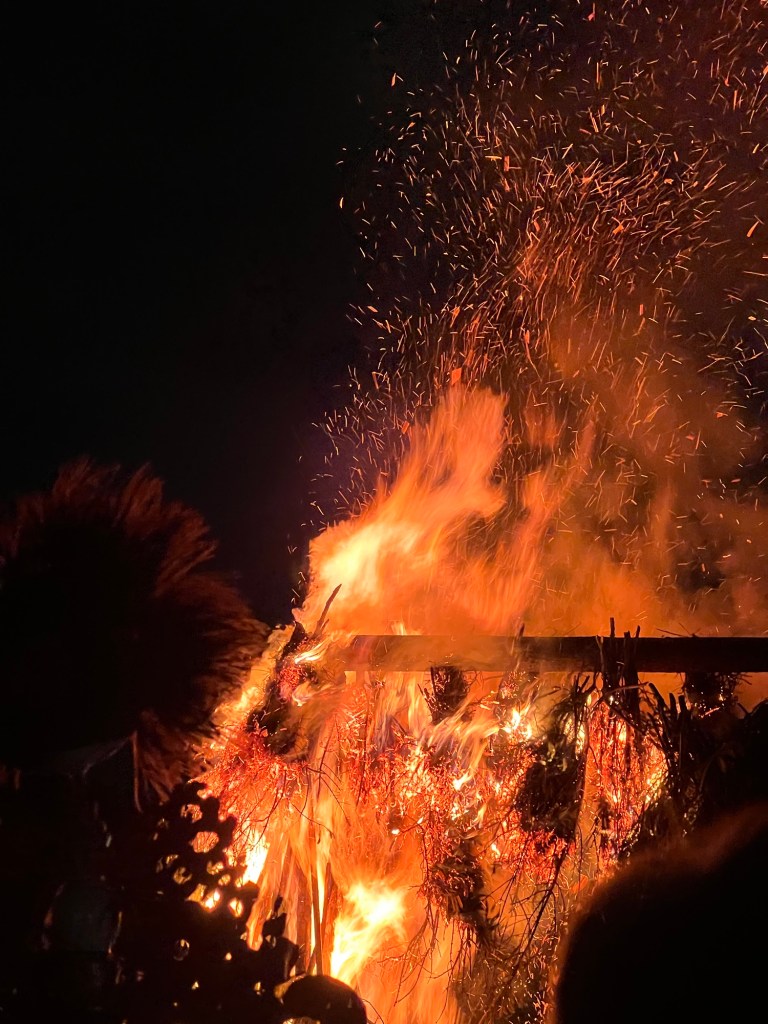 The flames, fed by gasoline and dried wood, bellowed over the edges and shot up high into the night sky.
