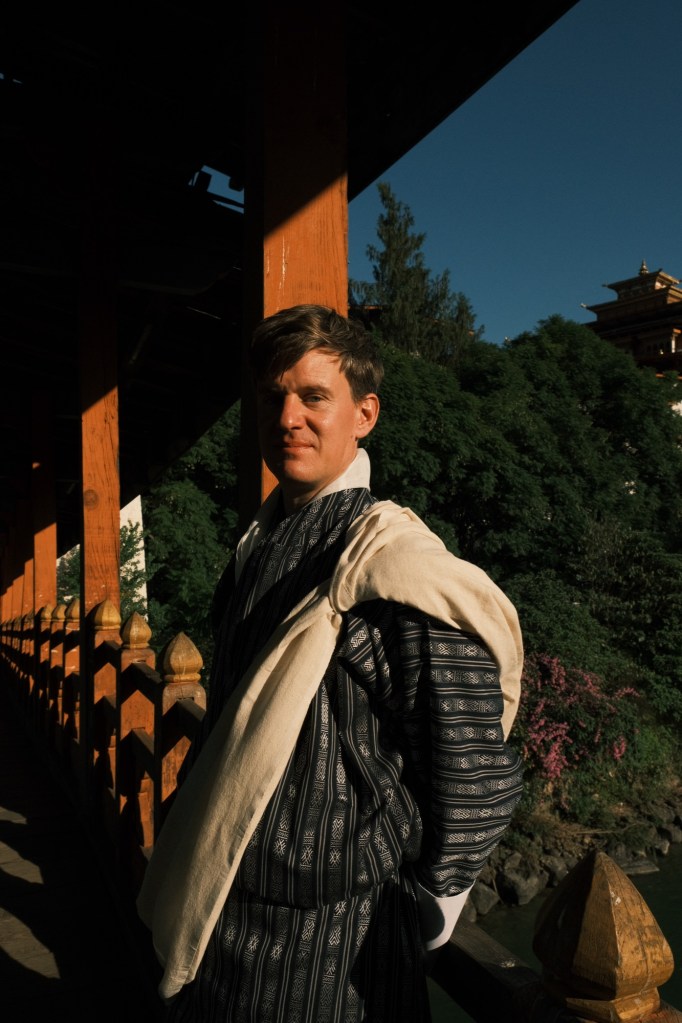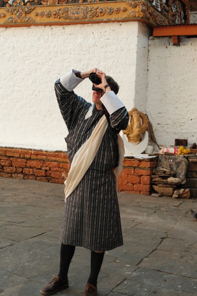 He’s also wearing a white shawl over his Gho, as required of civilians in Dzongs.